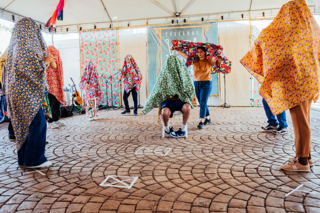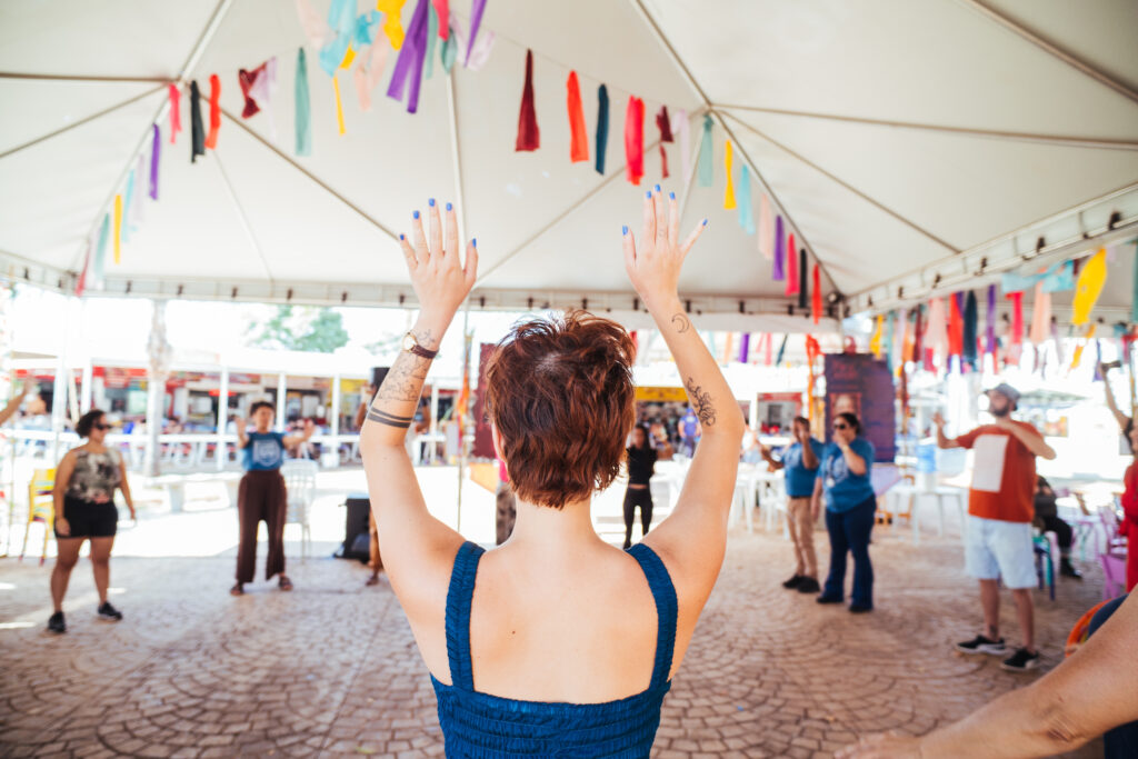 Léo – Eu chamo a atenção para o fato de que essa atividade abriu o Festival. Então, tinha o desafio de ser a primeira atividade no começo da tarde. Assim, as pessoas que estavam por ali, participaram de uma maneira não verbal. Isso amplia ainda mais a participação das outras pessoas e fortalece o visual estético. Então, quem estava de fora olhava os bamboleios, as pessoas circulando no centro do palco.