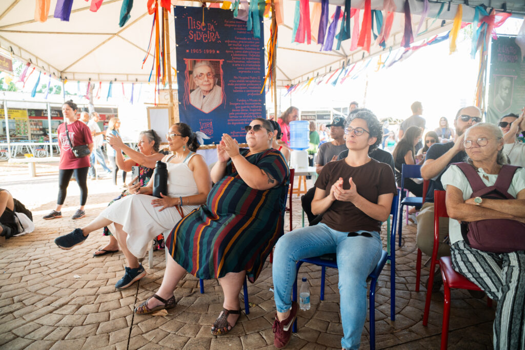 A roda de conversa, acho importante mencionar aqui, além de ter uma participação massiva, a gente também conseguiu reunir ali, pessoas bem relevantes do Distrito Federal, como o deputado Fábio Félix, a representante da Subsecretaria de Saúde Mental, representantes do CAPS Paranoá, da Inverso, da Anankê. A gente teve muita participação também de pessoas trans que estavam por ali e usuários do serviço de saúde. Eu acho que esse foi um momento comovente. A gente falando sobre as questões do tratamento em liberdade, de letramento antimanicomial e as pessoas trazendo a experiência que elas tiveram. Por serem usuárias, algumas agradeceram por hoje ter um SUS que oferece CAPS, que oferece um tratamento mais humanizado, e outras que passaram por um processo manicomial. Pessoas que foram à força ou enganadas, levadas para instituições de tratamento, que viveram experiências muito ruins lá dentro, e conseguiram outros cuidados depois, mas que passaram por situações traumáticas em instituições manicomiais.  As rodas de conversa foram muito ricas nesse sentido.