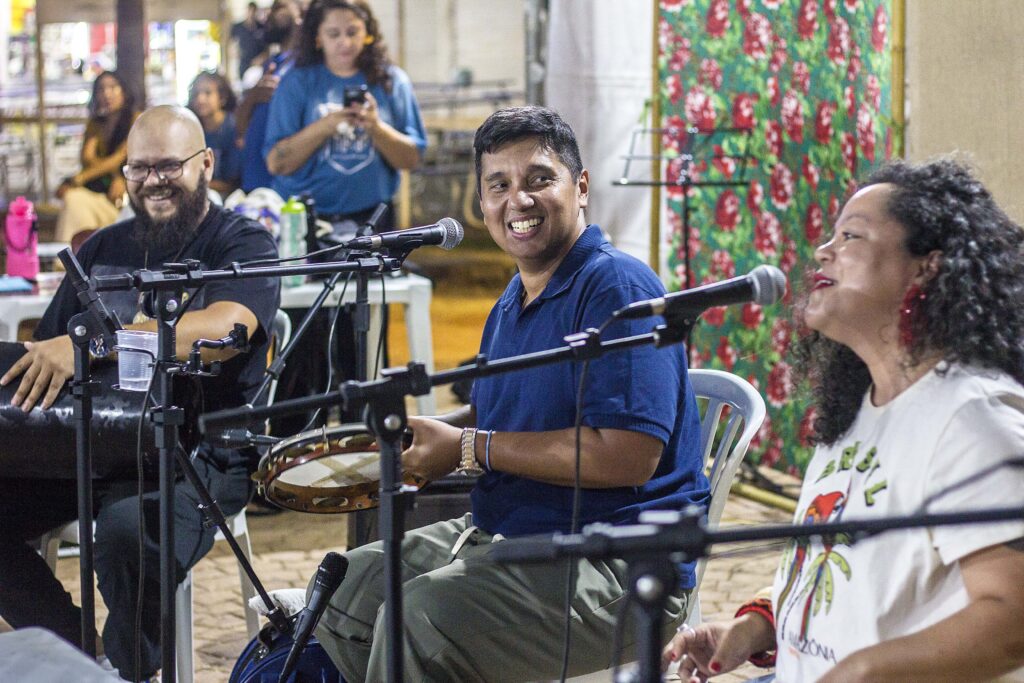 Essa vivência do domingo foi conduzida pelo Akimin. Ele é um músico-percussionista popular, que se utiliza de ritmos de matriz africana, afro-brasileira. Ele realiza trabalhos em diversas instituições e faz parte também de uma instituição afro-cultural. A oficina dele foi muito interessante por ter sido muito interativa. Ele chegou, disponibilizou os instrumentos e foi chamando pessoas, distribuindo instrumentos e orquestrando. A ideia era que as pessoas pudessem tocar o que já soubessem, e experimentar ritmos que ele estava levando, mas também incluir pessoas que ainda não tinham contato ou sem grandes habilidades instrumentais. Então, lá na hora, tinha criança no meio da brincadeira. Parecia mesmo uma brincadeira, vamos dizer assim, ou um brinquedo, como o pessoal da cultura popular chama.