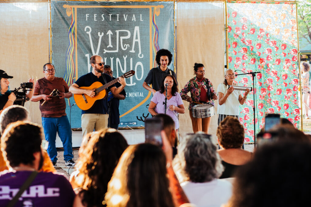Eu trabalho no Centro de Convivência da Anankê, que é uma hospital-dia que tem um Centro de Convivência. Outras instituições que tiveram com a gente também, a Inverso, que é um Centro de Convivência, uma ONG, independente, aqui na Asa Norte. A gente teve também a Alessandra Rizzi, que é uma das organizadoras do Encontro da Arte, que também promove um espaço de convivência entre diversas instituições e atores. Essa temática foi inspirada na tese de doutorado de uma pessoa, uma mulher que é a Artenienessa, que tem um olhar mais aprofundado ainda sobre a convivência como dispositivo de cuidado. O Festival em si explicita o quanto que a convivência pode ser um dispositivo de cuidado. Quando a gente cria um ambiente com atenção a isso, atento ao que está sendo produzido, atento às relações que estão sendo estabelecidas, atento às sutilezas que atravessam nossas relações enquanto pessoas, a quem a gente dá a voz, a quem a gente potencializa a voz, ainda que as estruturas precisem de uma organização. Essa organização precisa de uma ordem, que não precisa ser autoritária, não precisa ser uma hierarquia de poder e sim de organização.
