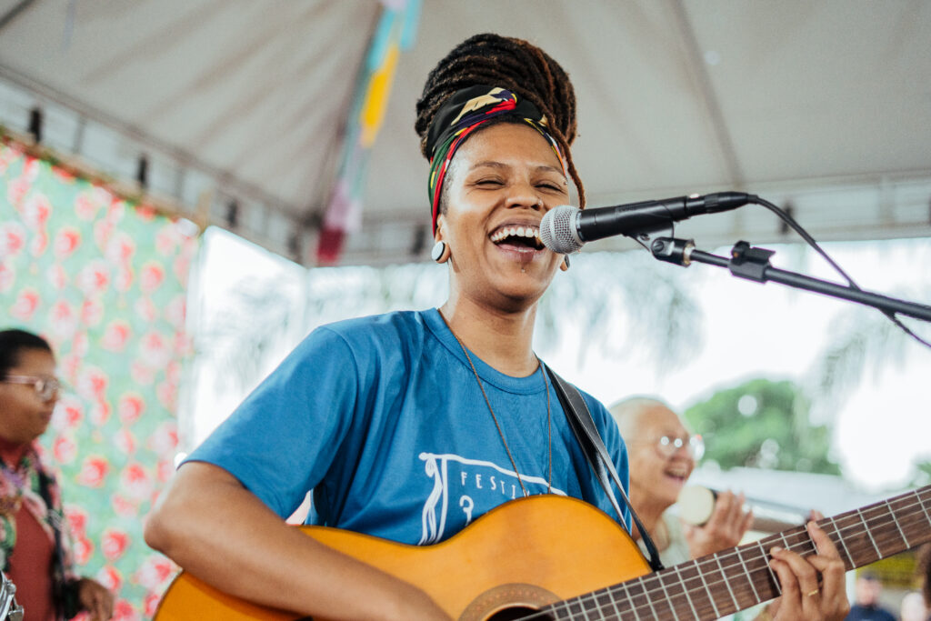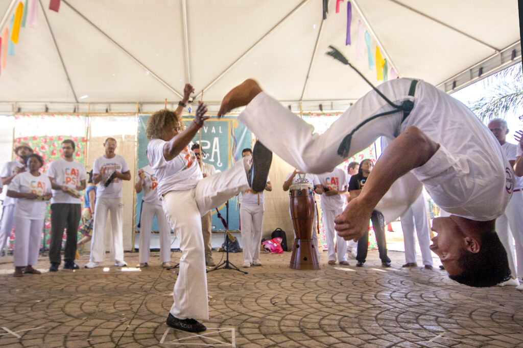 Foi uma oficina muito divertida e foi também uma preparação para o que viria na sequência, que foi a apresentação do CAPS Paranuê. Foi uma cadência de apresentações dessa linha afro-brasileiraO CAPS Paranauê é uma atividade de capoeira que acontece lá no CAPS do Paranoá. Foi um trocadilho, porque tem a música bem famosa da capoeira, que é o Paranauê, Paranauê. Aí fizeram esse trocadilho. Então, tem uma atividade lá que já acontece há alguns anos, que é conduzida pelo Antônio. Eles são do grupo Beribazu. Ele promove atividades de capoeira, oficinas de capoeira e de musicalização a partir da capoeira, lá dentro do CAPS, para os usuários do CAPS. Eles levaram para o festival, uma roda de capoeira, meio roda, meio apresentação.